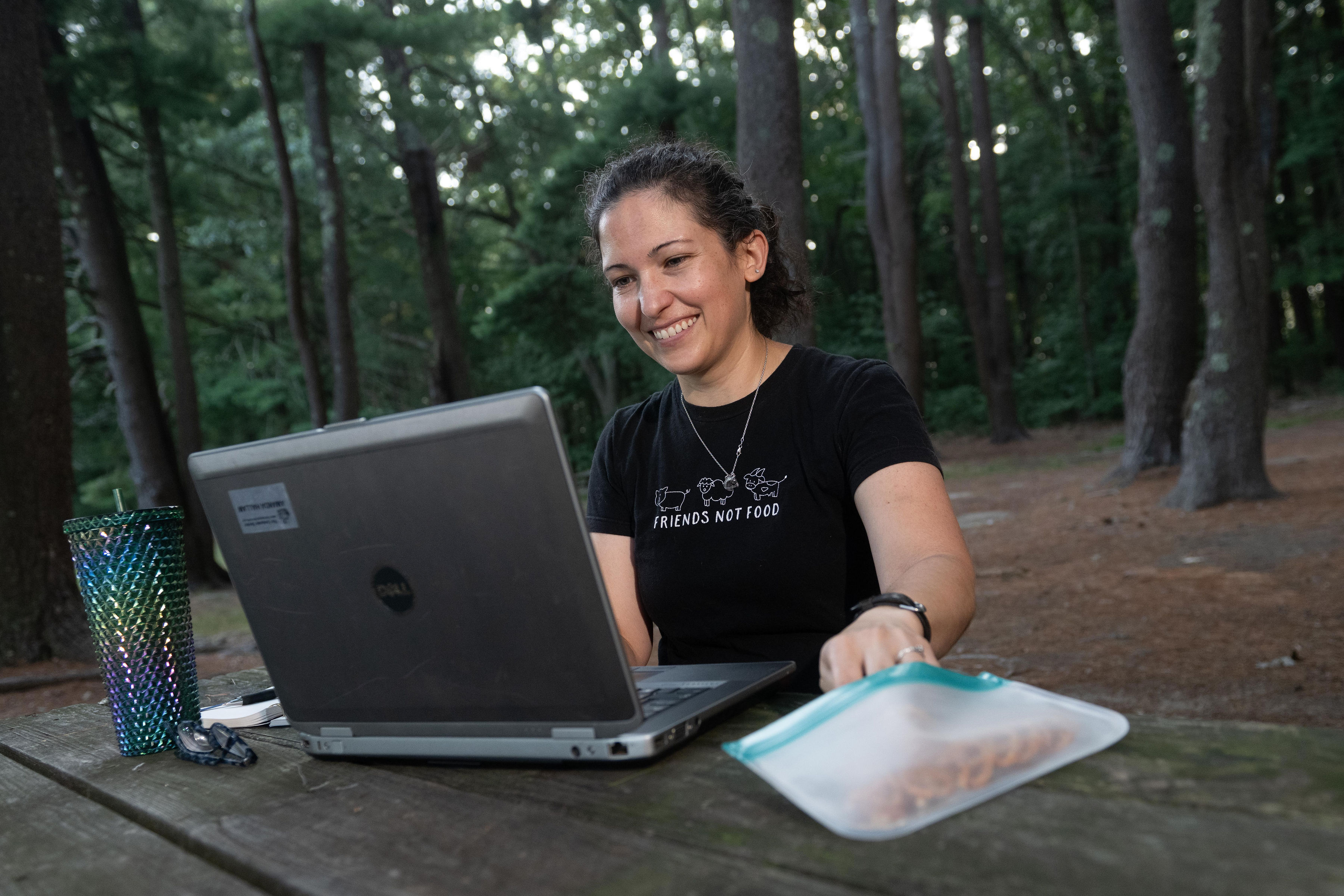 Here, we have the rare Stegamandasaurus in her natural habitat. Surrounded by trees and sustained by coffee and snacks, a smile appears permanently plastered on her face.